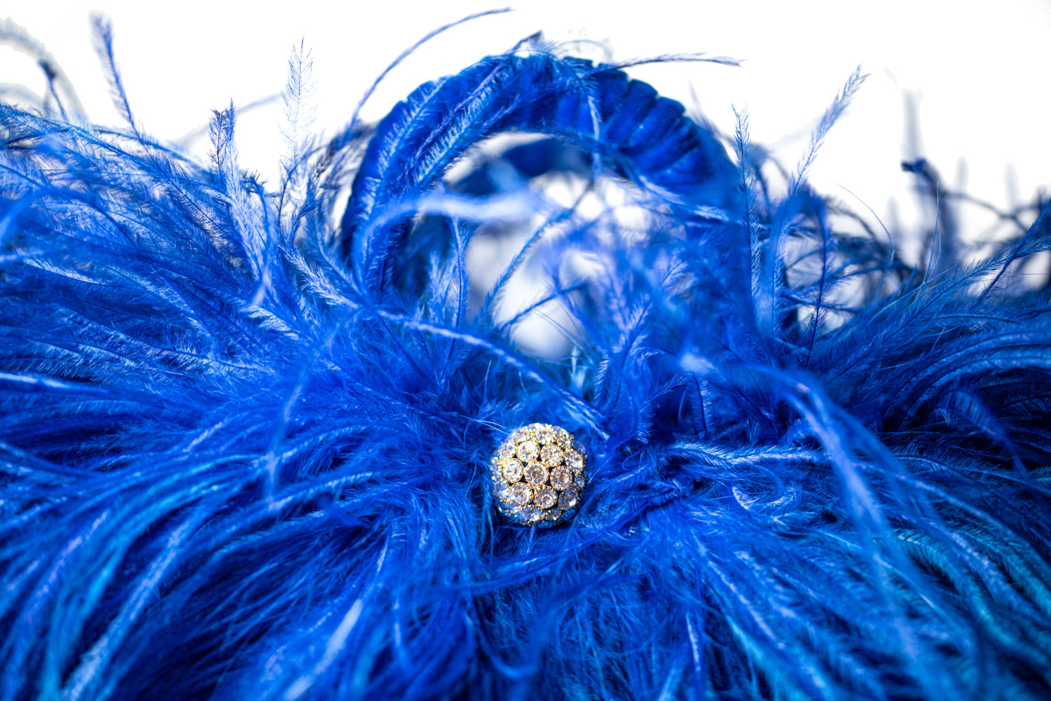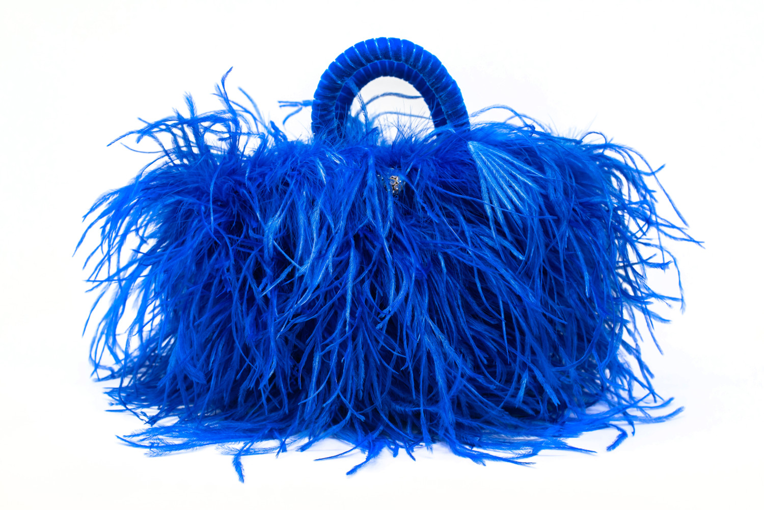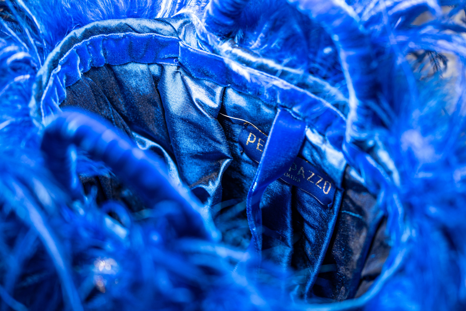 Foglie di palma nana, shantung di seta, piume di struzzo, nastro di velluto.