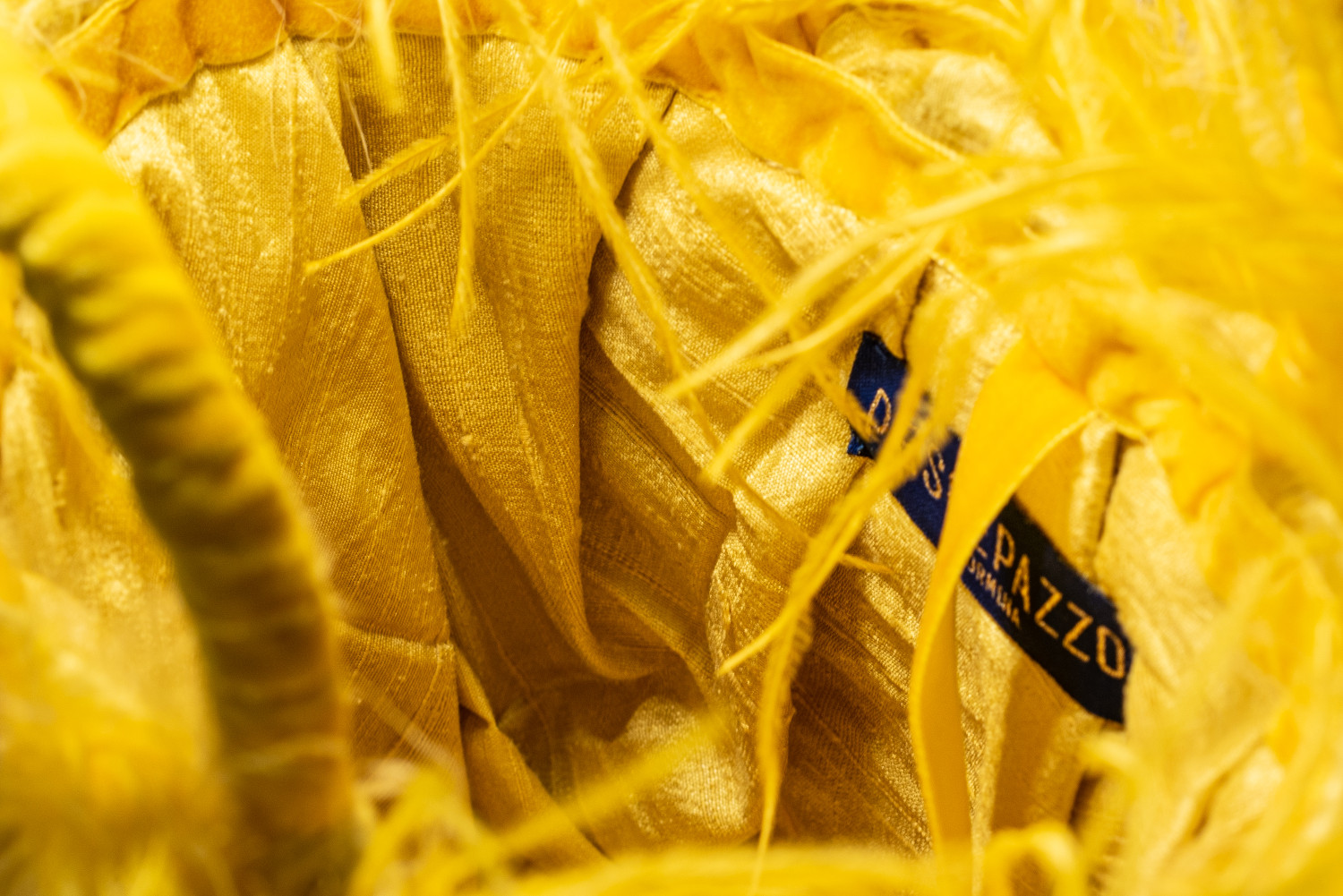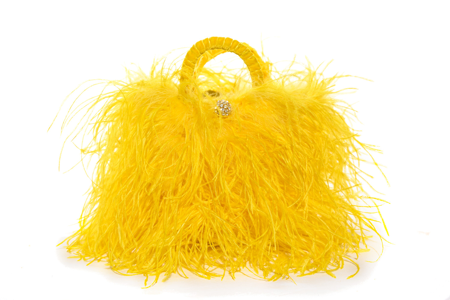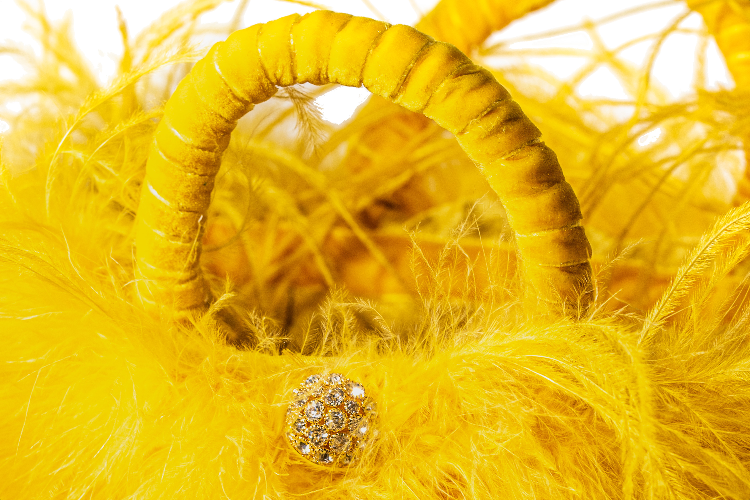 Meravigliosa coffa siciliana intrecciata a mano con foglie di palma nana dell’isola. La borsa è interamente rivestita in shantung di seta gialla e arricchita da piume di struzzo dello stesso colore. I manici e le altre finiture sono realizzati in nastro di velluto e la coffa è impreziosita da un bottone gioiello argentato.
