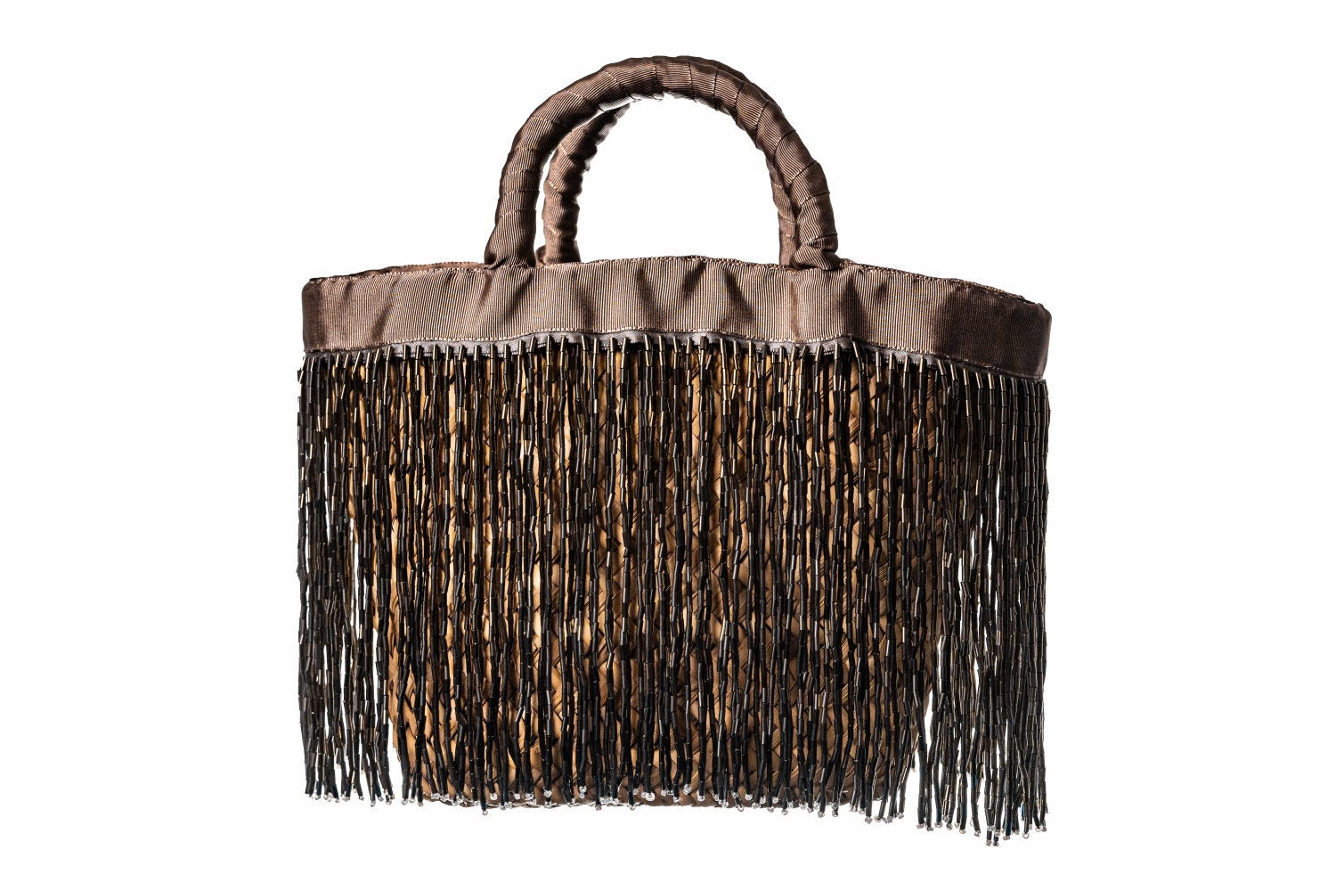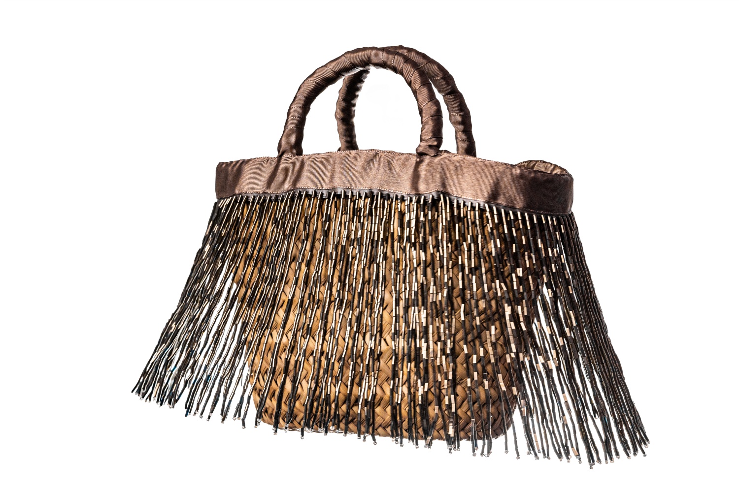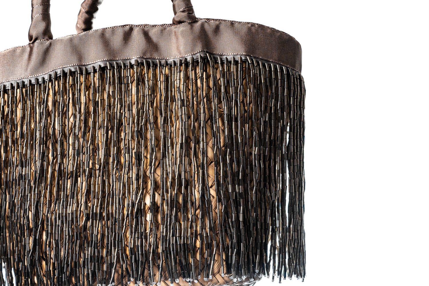 Coffa siciliana intrecciata a mano con foglie di palma nana. L’interno della borsa è rivestito in shantung di seta grigio tortora e l’esterno è arricchito da una frangia di canottiglie di perline a tubetto in vetro dello stesso colore. I manici e tutte le finiture sono realizzati in nastro di gros grain ed è inclusa una tracolla removibile a maglia dorata.