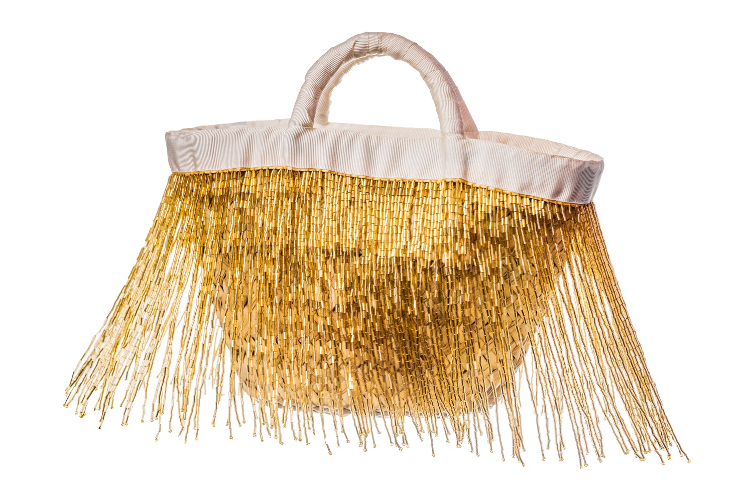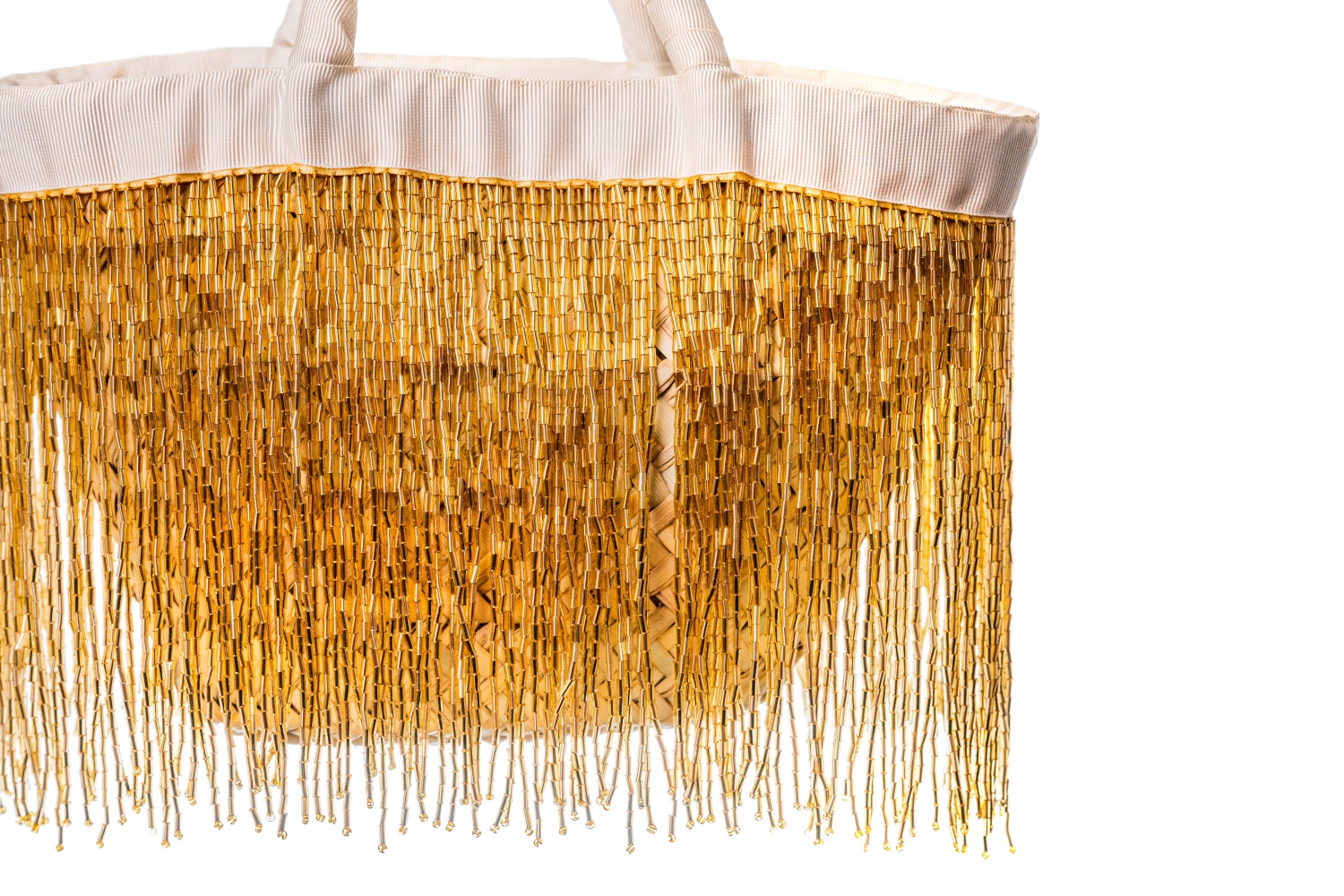 Foglie di palma nana, shantung di seta, perline a tubetto di vetro, nastro di gros grain, catenella metallica.