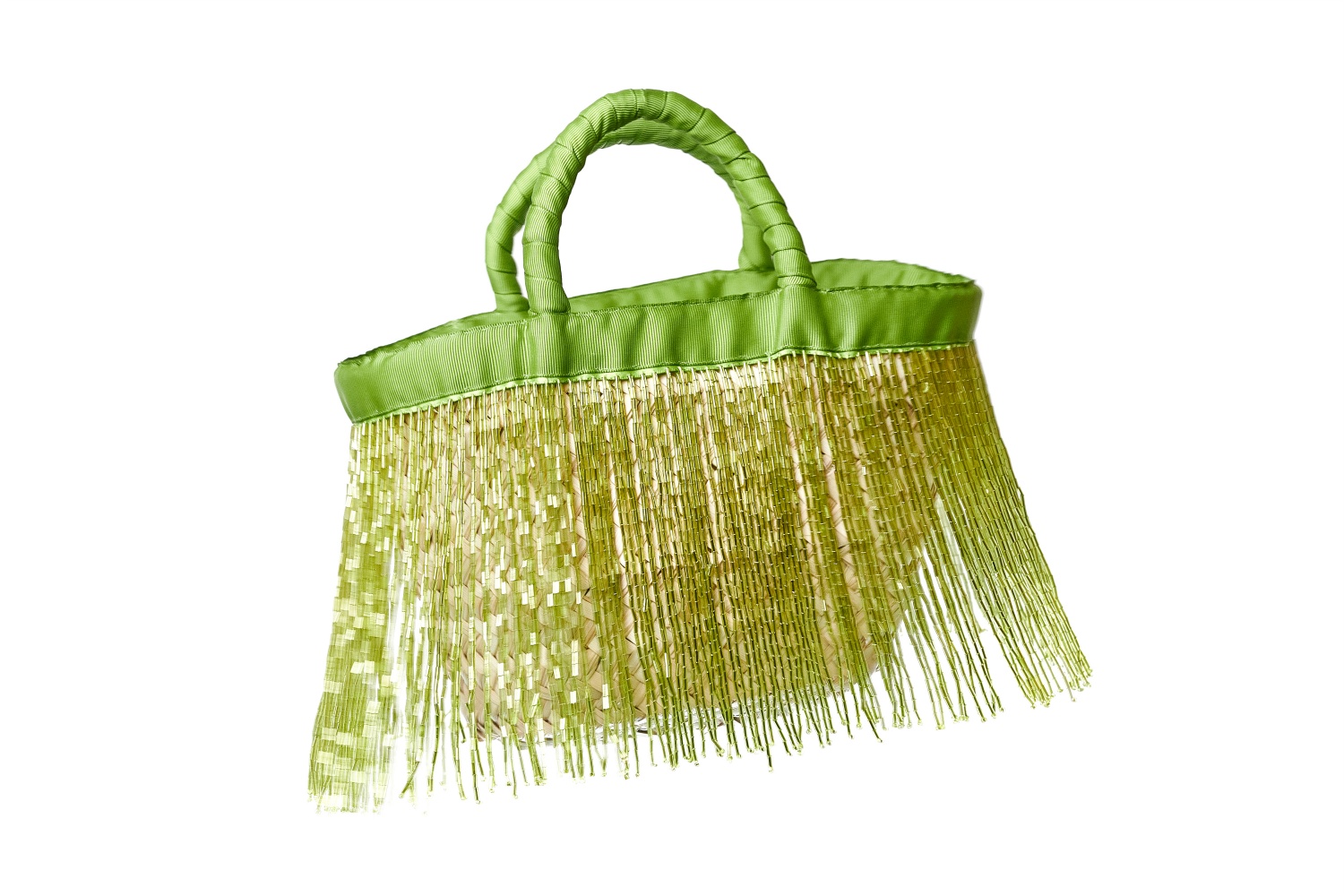 Coffa siciliana intrecciata a mano con foglie di palma nana. L’interno della borsa è rivestito in mikado di seta verde lime e l’esterno è arricchito da una frangia di canottiglie di perline a tubetto in vetro dello stesso colore. I manici e tutte le finiture sono realizzati in nastro di gros grain ed è inclusa una tracolla removibile a maglia dorata.