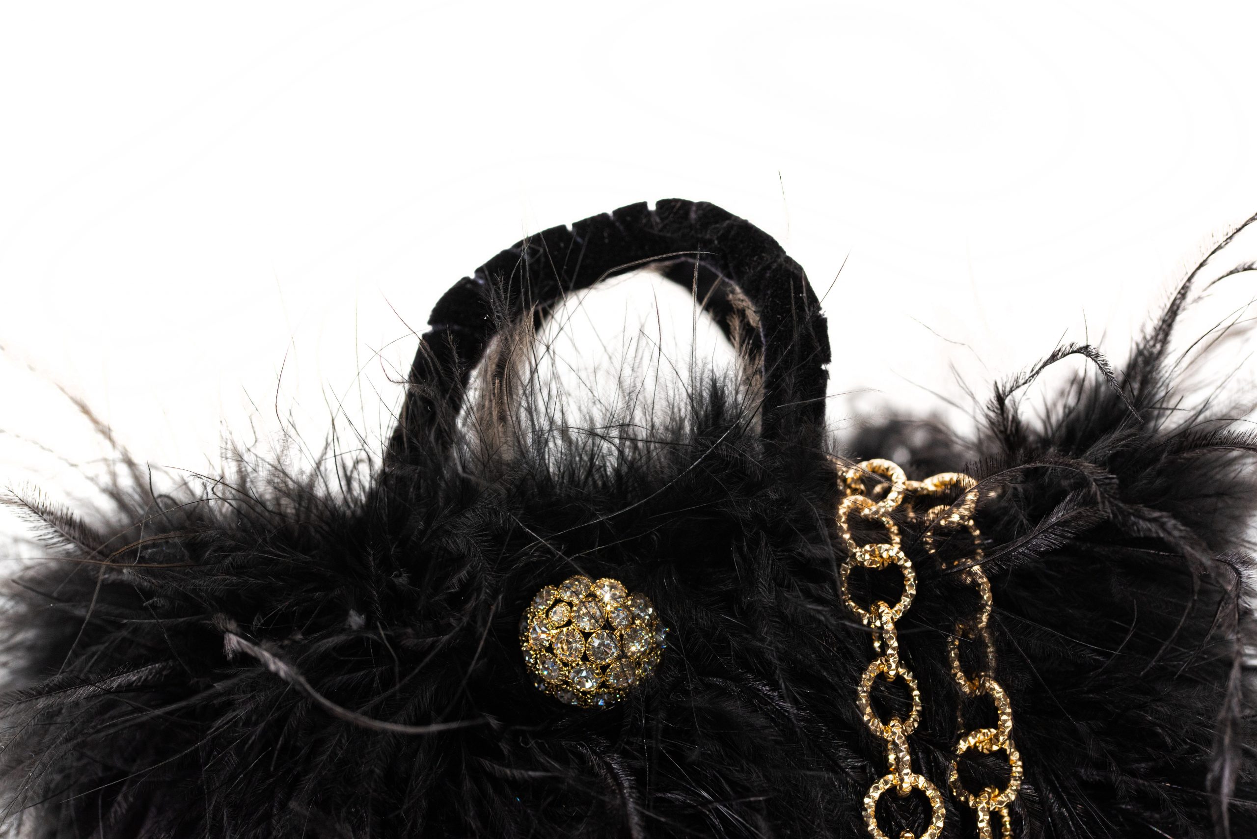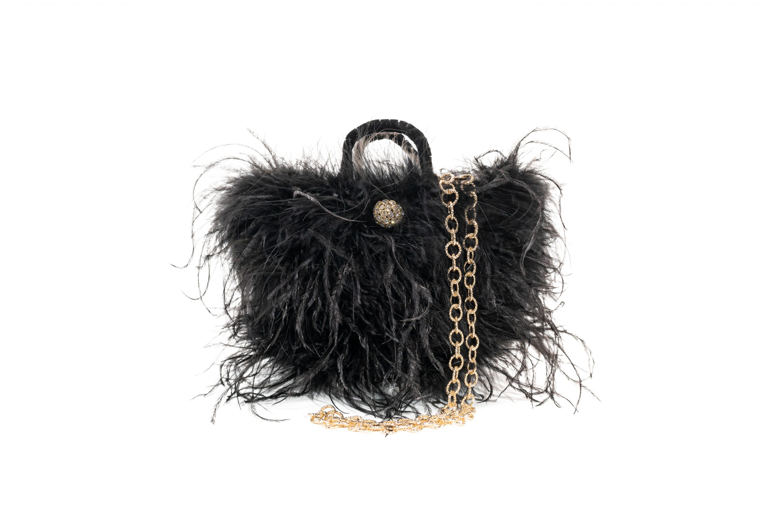 Meravigliosa coffa siciliana intrecciata a mano con foglie di palma nana dell’isola. La borsa è interamente rivestita in shantung di seta nera e arricchita da piume di struzzo dello stesso colore. I manici e le altre finiture sono realizzati in nastro di velluto e la coffa è impreziosita da un bottone gioiello e da una tracolla a catenella dorata.