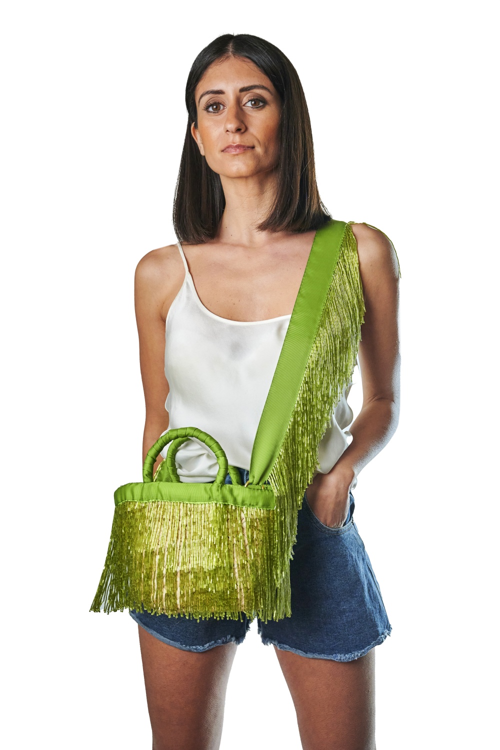 La tracolla è realizzata a mano in nastro di gros grain verde lime e arricchita da una frangia di perline a tubetto in vetro dello stesso colore. La tracolla è dotata di due anelli removibili che consentono di applicarla sulla Nuda o su qualsiasi altra borsa ed è possibile indossarla a spalla oppure crossbody.